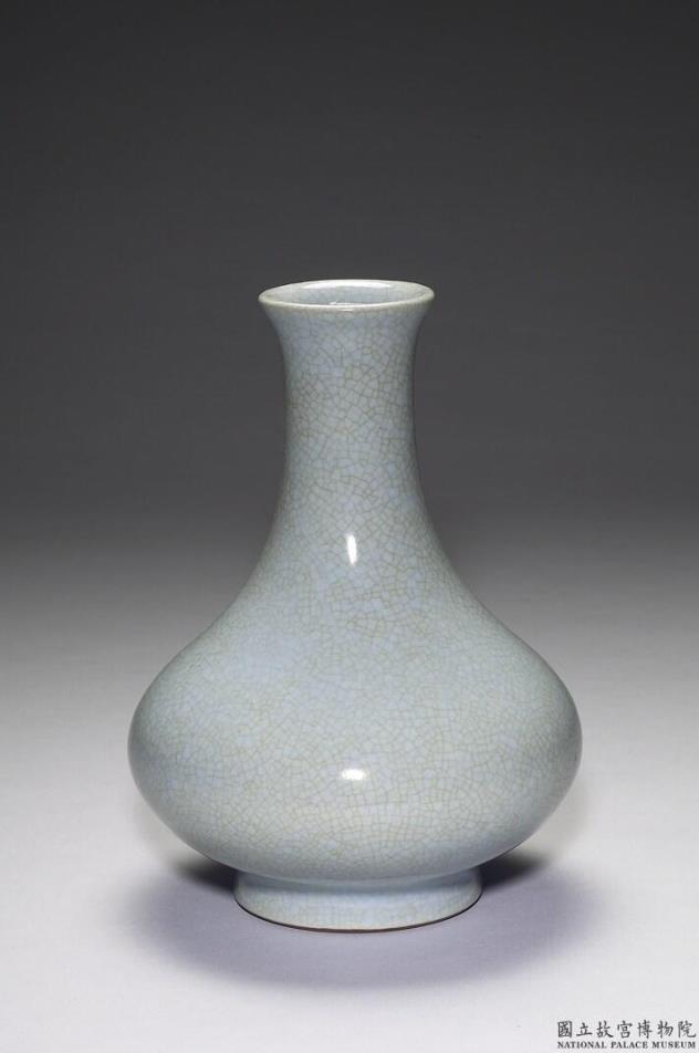 侈口,长颈,溜肩,扁圆广腹,矮圈足。全器施冬青釉,带蓝色调,釉面微见浅色开片纹。足缘呈深褐色,底书「大清乾隆年制」青花六字三行篆书款。