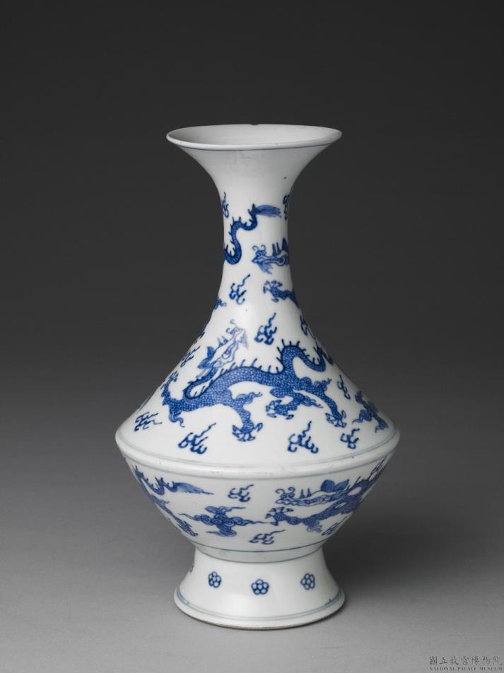 侈口直颈,削肩,折腰下敛,圈足外撇。器外壁白地釉下钴蓝绘龙纹为饰,龙与龙间绘有火纹及云纹,足墙外饰四瓣小花,足内露胎,中心白地青花书「大明成化年制」双行六字款。由于外壁所绘龙的头部造型较不威猛,款字书写不若习见成化款之整齐,此外由器型折腰直截看来,似乎与雍正朝制作有相接处。或许这是一件清代民间制作的仿成化瓷作品。
