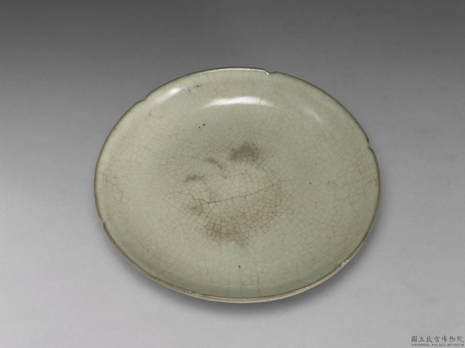 六瓣花口,弧壁渐收,圈足。整器施官釉,釉色温润柔和,器内外满布细碎开片。圈足露胎一圈涂褐色汁,足内亦施官釉。