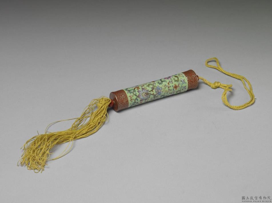 瓷牙签筒,作圆筒形,中空以装牙签,外壁彩绘缠枝花卉图样。一端可打开为器盖,盖上穿绳,接贯器底,出为丝穗,以固定、调整器盖的开阖。上下两端以红釉为地再装饰金色卷草花纹一圈。器身外壁满饰草绿色底釉和缠枝番莲纹。