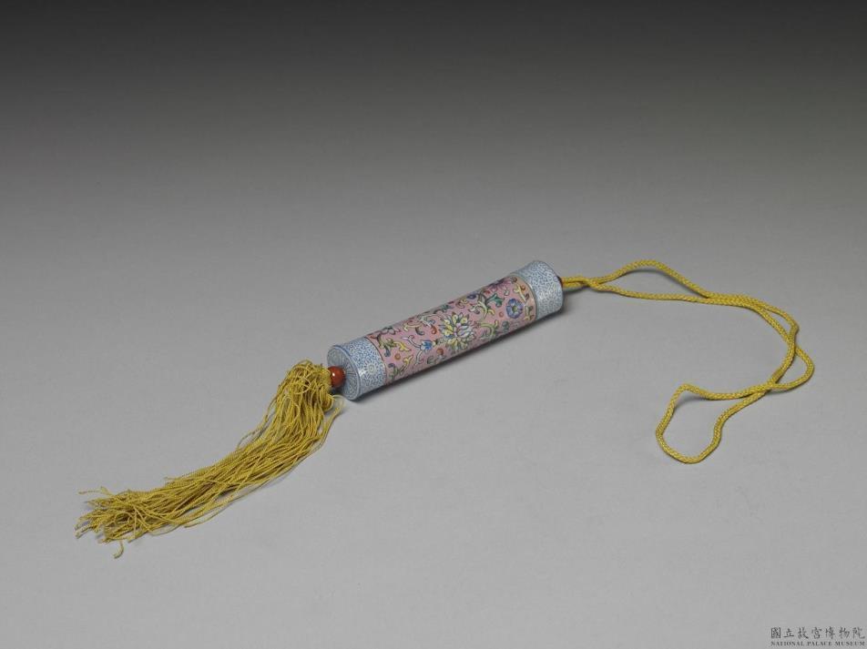 瓷牙签筒,作圆筒形,中空以装牙签,外壁彩绘缠枝花卉图样。一端可打开为器盖,盖上穿绳,接贯器底,出为丝穗,以固定、调整器盖的开阖。上下两端以白釉地再装饰蓝色卷草花纹一圈,中央器身满饰粉红色底釉和缠枝番莲纹。