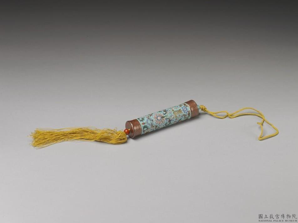 瓷牙签筒,作圆筒形,中空以装牙签,外壁彩绘缠枝花卉图样。一端可打开为器盖,盖上穿绳,接贯器底,出为丝穗,以固定、调整器盖的开阖。上下两端以红釉为地再装饰一圈金色卷草花纹。中央器身满饰湖绿色底釉和缠枝番莲纹,其间并有金彩「寿」字与桃实,传达整件作品具有长寿的象征意涵。