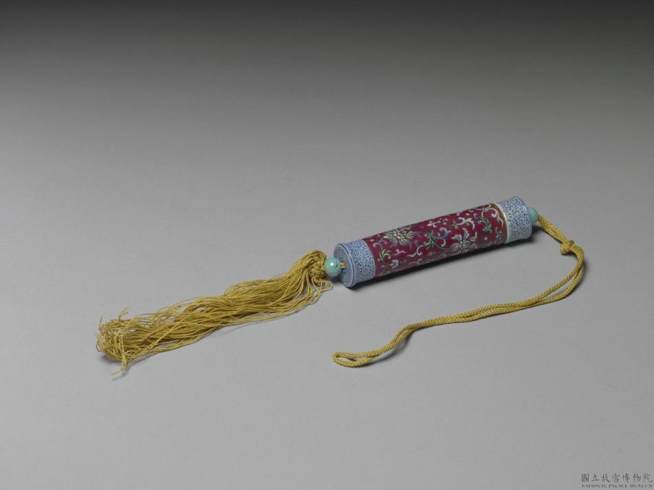 瓷牙签筒,作圆筒形,中空以装牙签,外壁彩绘缠枝花卉图样。一端可打开为器盖,盖上穿绳,接贯器底,出为丝穗,以固定、调整器盖的开阖。上下两端以白釉为地再装饰一圈蓝色卷草花纹。中央器身外壁满饰红色底釉和缠枝番莲纹。