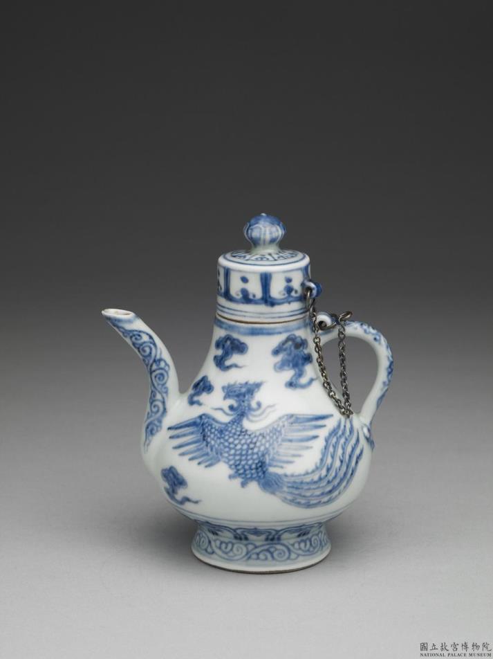 壶,小口,斜肩,垂腹,圈足稍高外撇,曲流,弯把,带莲苞钮平顶直壁盖,盖侧与流上各有一小圈环,装一金属炼以连结两者。外壁以青花为饰,壶身两面各绘一凤纹,周围饰云纹,下缘环绕莲瓣纹边饰,流与把皆饰卷草纹,莲苞钮及盖绘饰各种莲瓣纹,圈足外为卷草纹。足底缘露胎。