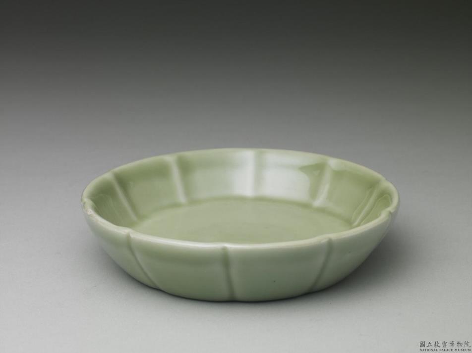 笔洗,十瓣花口,深壁略外弧而下敛,平底内凹成足。口缘随瓣形略凹,外壁亦随瓣形刻陷凹痕,并将外壁分割为十等分,除此凹痕外,外壁光素无纹。器内外施罩青釉,色偏浅翠绿,积釉处呈色较深。底外环形无釉垫烧区,中心圆形区内凹,施白釉并以钴蓝釉书「大清康熙年制」三行六字楷款。