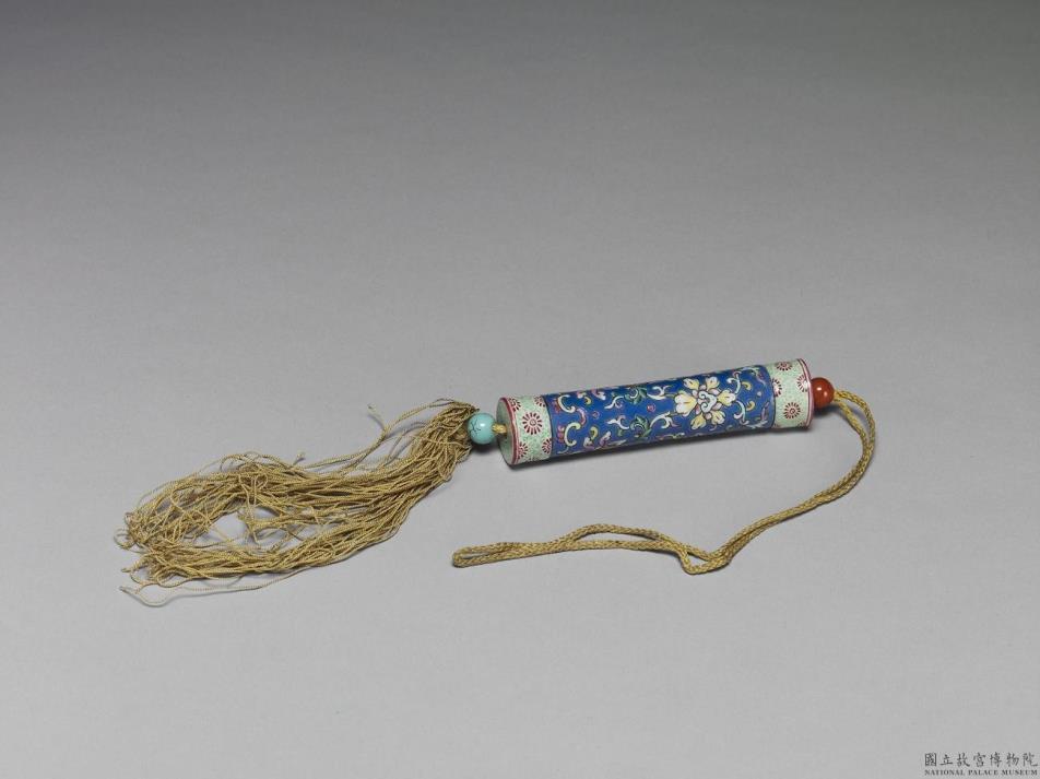 瓷牙签筒,作圆筒形,中空以装牙签,外壁以粉彩彩绘装饰纹样。上端为器盖,具子口,盖顶及器底绘花瓣纹;器身以宝蓝釉为地,彩绘缠枝番莲纹。使用一黄绳自盖接贯器底,出为绳结与丝穗,上下各串一红色及一松石色瓷珠,可用以固定、调整器盖的开阖。