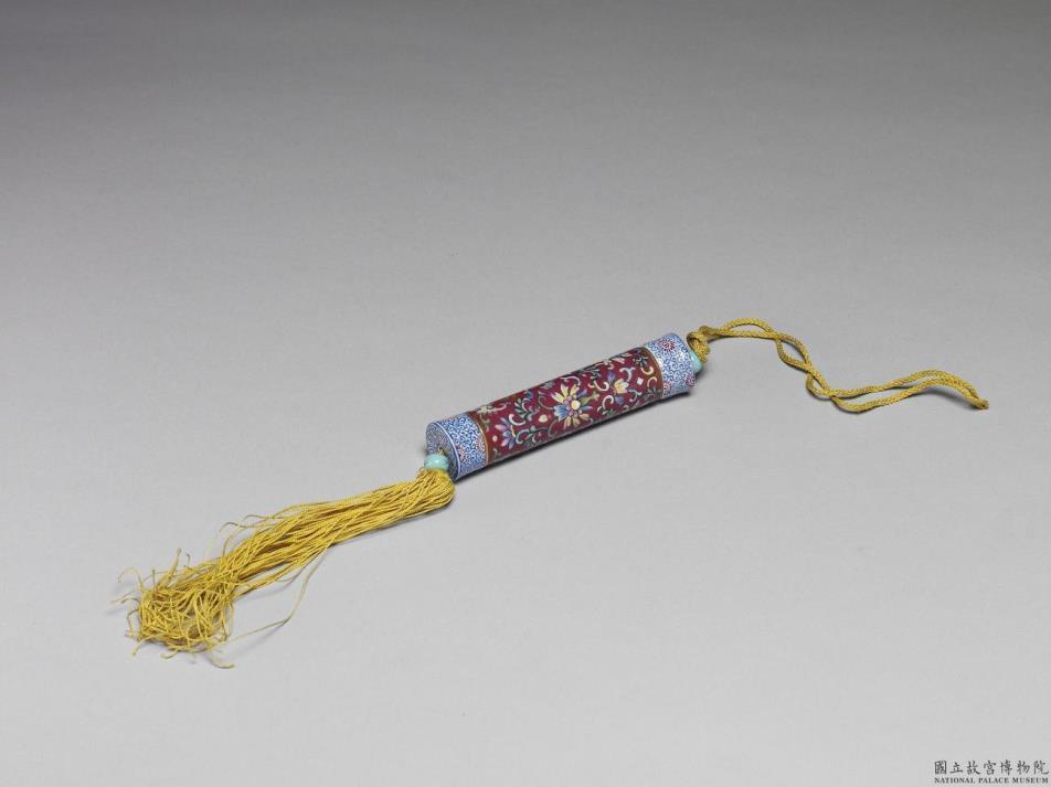 瓷牙签筒,作圆筒形,中空以装牙签,外壁以粉彩彩绘装饰纹样。上端为器盖,具子口,盖顶及器底绘花瓣纹,器身以紫红釉为地,彩绘缠枝番莲纹及蝙蝠衔「卍」字,象征万福。使用一黄绳自盖接贯器底,出为绳结与丝穗,上下各串一松石色瓷珠,可用以固定、调整器盖的开阖。