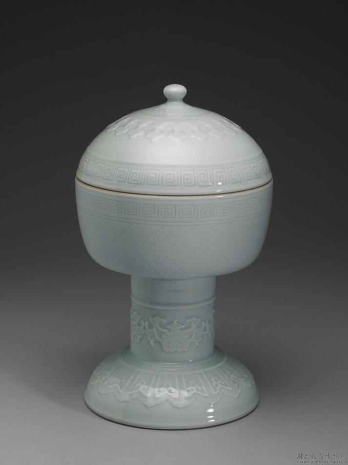 仿古祭祀用豆形器,盖腹呈盒状,珠纽,子母口,高圈足。通体施青釉。盖面纽心印饰菊花纹,外围一圈弦纹覆印如意裙叶。子母口沿处各印饰一圈回纹,器身衬印雷纹。高足,带覆座。足身凸起弦纹一道,弦纹下也衬印雷纹,凸饰变形兽面纹,足座敷印花式裙叶,其上凸印鱼形纹饰。器底及足底各刻印「大清乾隆年制」六字三行篆款。