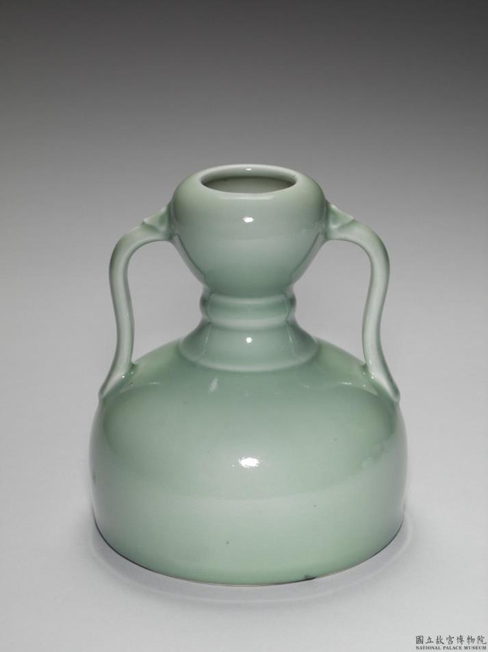 本器外型类似葫芦,上半部类似蒜头口,近于丰肩下敛的钵形。下半部则深壁略外弧,平底内凹成足,其形犹如弧底的覆钵。上下由一带凸棱的短颈连接,口肩部两侧各以S形的如意形耳相连,被视为是雍正时期新出现的器形。外壁罩青瓷釉,釉层莹润。底外施青釉,釉下以青花书「大清雍正年制」三行六字篆款。这一类的器形,亦见有白地青花者。