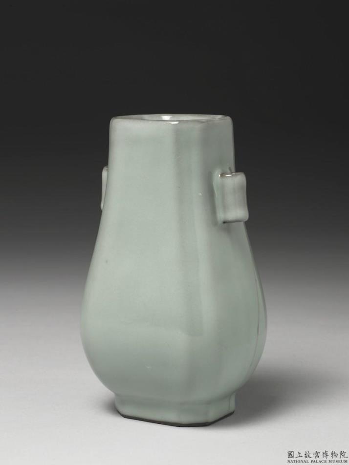 仿铜器贯耳壶造型,口足做方形,四角削边,呈八面造型;斜肩,垂腹。斜肩贴饰一对贯耳。全器施仿官青釉,釉色均匀温润,釉面有浅色开片纹,口缘及贯耳上缘因流釉而呈淡褐色。圈足底缘涂护胎汁,呈黑褐色。底以青花书「大清乾隆年制」六字三行篆款。