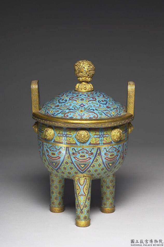 铜胎。直口,深壁,双立耳,圆底,三足,带镀金宝珠形钮穹顶形盖。镀金口沿,立身錾饰回纹。器表以掐丝技法、珐琅料填色制作纹饰,内壁施浅绿珐琅釉,盖钮铸饰云龙纹,盖身饰如意云纹变形兽面纹,双耳饰对龙纹,器身以浅蓝色为地,口沿饰回纹,下接变形兽面纹,间饰铜铸太极云纹钮,外壁中央及足部饰龟甲纹锦地蕉叶形开光,内饰变形兽面纹。外底有铸造去地阳纹「乾隆年制」双行楷书圆框款。