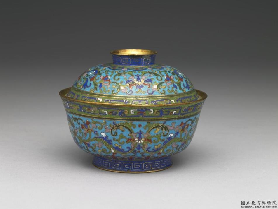 口微撇,深壁,圈足,带圆顶盖圈足钮。全器纹饰以掐丝技法完成,器表浅蓝地,盖及碗外壁饰五彩番莲纹,圈足及盖钮外侧饰深蓝地回纹,盖钮周围有一圈如意云纹,钮顶为红地深蓝变形团寿字,腹底饰一圈莲瓣纹,盖缘及碗缘为绿底深蓝掐丝拐子龙纹,底无款。