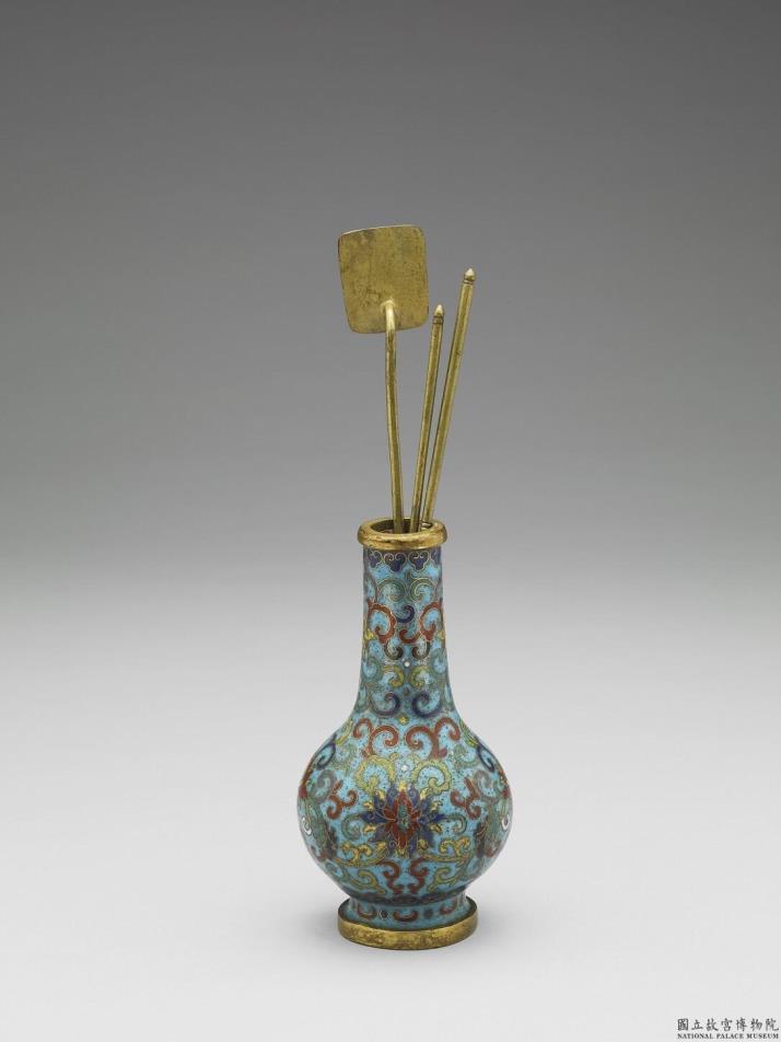镀金口,长颈,斜肩,圆腹,圈足。全器纹饰以掐丝珐琅技法完成,浅蓝地,口沿下缘及腹下缘饰一圈如意云纹,颈及腹饰番莲纹,圈足饰几何纹。底有阴刻「乾隆年制」横向单行楷款,及一「城」字。附方形铜铲一只,铜箸一副。中珐66、67、68为一组。