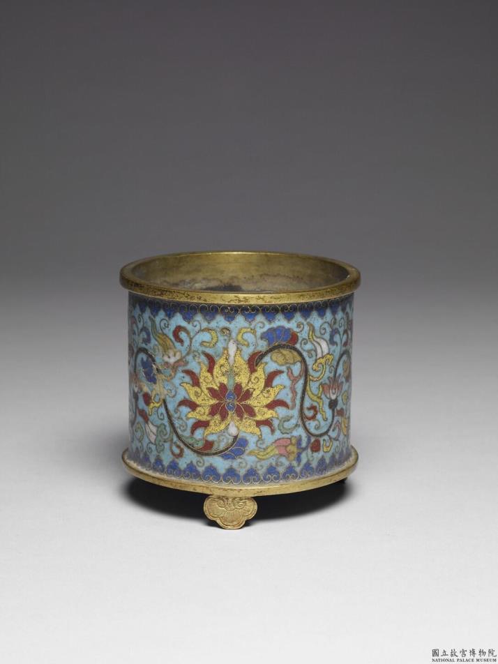 直口,筒腹,平底,三如意形足。全器浅蓝地,以掐丝技法于口缘及腹底各饰一圈如意云纹,腹表饰转枝番莲纹,底部饰葵花纹。