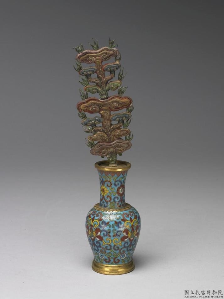 铜胎。敞口、长颈、斜肩、敛腹、矮圈足。全器以掐丝技法、珐琅料填色制作纹饰,浅蓝地,颈部饰葵花及菊花,器身饰番莲纹,圈足露胎无纹。附铜胆及铜胎外髹色漆描金之灵芝。底部露胎,有阴刻「乾隆年制」二行楷书双方框款。瓶为五供之一,本器与中珐193-中珐197成套。