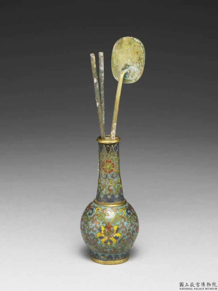铜胎,圆口,长颈下驰,硕腹,圈足。器身蓝地,以掐丝技法制作花纹,颈部卷枝花卉,腹壁满饰缠枝番莲,足上如意云头纹一圈。足内露胎,上刻「大清乾隆年制」六字楷款与「人」字楷款。本器与他件炉、盒共成「炉瓶盒三件」。