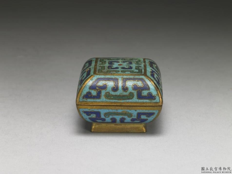 方形,子母口,深壁,平底,方形底座,带梯形子母口盖一只。全器浅蓝地,以掐丝技法于器表饰几何纹。中珐388、389、390为一组。