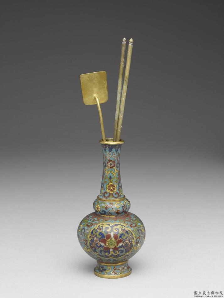 铜胎,侈口,长颈,颈腹间作凸棱,硕腹,圈足外撇。器表浅蓝地,以掐丝技法制作花纹,颈、凸棱和足饰缠枝花卉,腹外壁有深蓝地八瓣花形开光,开光内饰一缠枝番莲花叶,开光外则满饰缠枝花叶,上下各一圈红色如意云头纹。足内镀金,上刻「大清乾隆年制」与「芥」字千字文楷款。附铜箸一双、香铲一支。本器与他件炉、盒共成「炉瓶盒一组」。