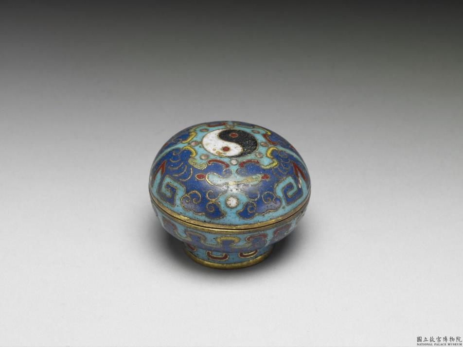 子母口,深壁,圈足,圆顶子母口盖一只。全器浅蓝地,器内施蓝绿釉,以掐丝技法于盖面与腹部饰龙纹,盖顶中央为一太极图案,足部饰一圈几何纹。