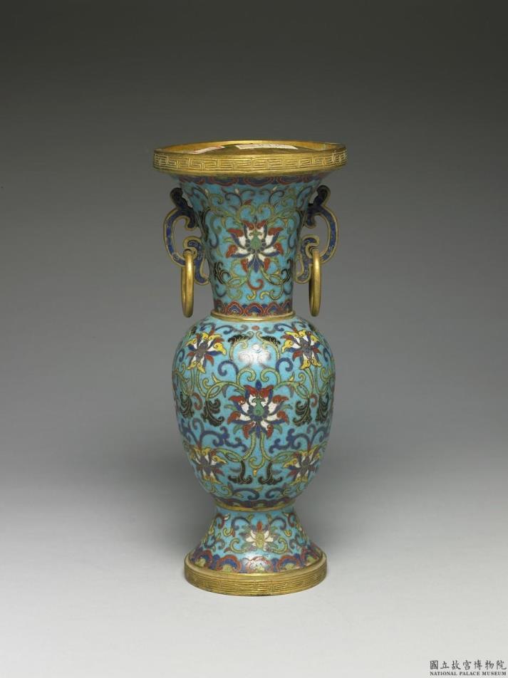 铜胎。侈口,短颈,斜肩,硕腹下敛,高撇足,双云耳带活环。口缘与足皆錾回纹一圈。器身浅蓝地,以掐丝技法制作花纹,全器主要以番莲纹为饰。底外刻「乾隆年制」双方框二行四字楷款。附铜胆。一般以烛台二、瓶二、香炉一同成五供,本器即五供的组成器之一。