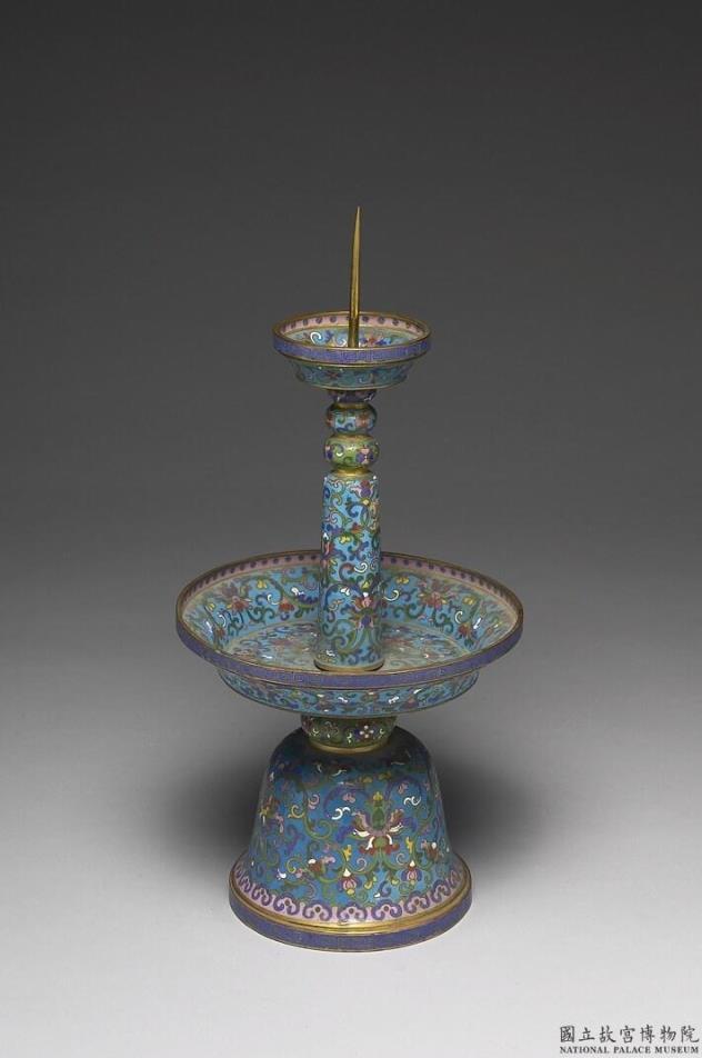 铜胎。由钉形烛阡,支柱,托盘及台座组成。器身以浅蓝色为地,以掐丝技法制作花纹,全器饰缠枝番莲纹,托盘口缘及台座下缘外侧饰回纹,台座下端饰如意云纹边饰。烛台为五供之一,本器与中珐726~730成套。
