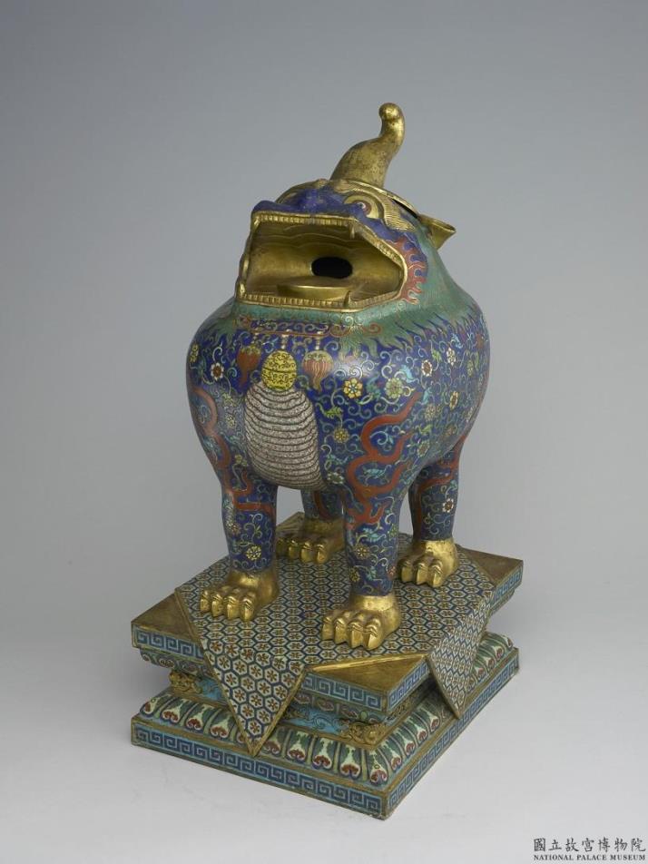 甪端作立体独角兽形,靛蓝地色,下有长方形座,无颈,巨嘴獠牙、弯角、小耳、矮尾,其状颇怪。据《宋书‧符瑞志》载:「甪端者,日行万八千里,又晓四裔之语,圣主在位,明达外方幽远之事,则捧书而至。」故角端之制作,乃象征政治修明。四海归心之意。兽身饰掐丝菊花。方座中间凹入,作倒上下反迭形,上层饰半透明灰蓝地靛蓝龟背纹锦,台边上下饰背莲瓣,中间凹入部分于掐丝地纹上饰一周铜浮雕镂空转枝花边。花纹之色彩变化为红、黄、白、蓝、紫、绿、淡绿等色。角、嘴、足、皆铜镀金。