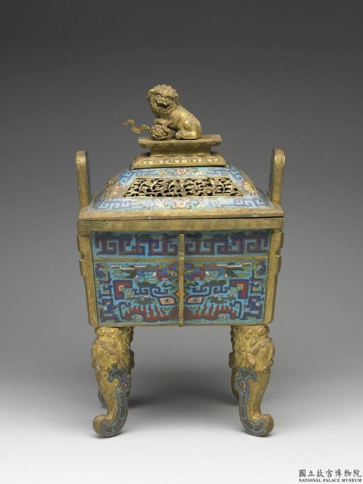 铜胎。长方形,敞口,深壁,双立耳,四螭形足,带镀金狮戏球钮盖,四边及四面中央出戟。全器以掐丝技法、珐琅料填色制作花纹,浅蓝色地盖身饰镀金镂空祥云蝙蝠纹开光与掐丝珐琅花卉纹及夔龙纹,镀金耳饰回纹、夔龙纹及兽面纹,器壁饰夔龙纹及变形兽面纹,器底饰葵花纹。香炉为五供之一,本器与中珐1034-中珐1037成套。