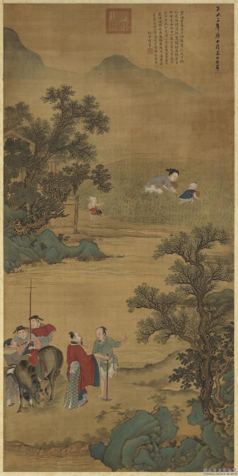 夏朝末年,意欲讨伐夏桀的商汤,苦无贤士协助。他听说当时莘国伊尹,虽然以农耕为生,但贤名远播,非常有才能,因此数次请人前往征聘。伊尹最后终于答应了,并在政治和军事上辅佐汤王,成功地建立商朝。 图上有元代赵孟俯(一二五四-一三二二)的款识,不过由人物树石细腻多彩的敷色方式及格套式的构图来看,应为十七世纪的拟古之作。