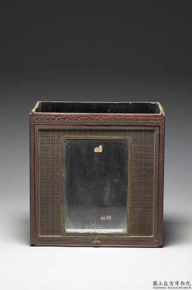 剔红方龛,色暗红,略有伤损,本件仅存四围龛壁,顶与座皆无。长方形,除背面外皆饰连续回纹为边,正面以篆字为地,中有长方形嵌玻璃开光,下有铜片饰件,应可开启,二短面以番莲纹为地,上方有较小嵌玻璃开光,背面刻饰宝相花。器内壁髹黑色光漆。