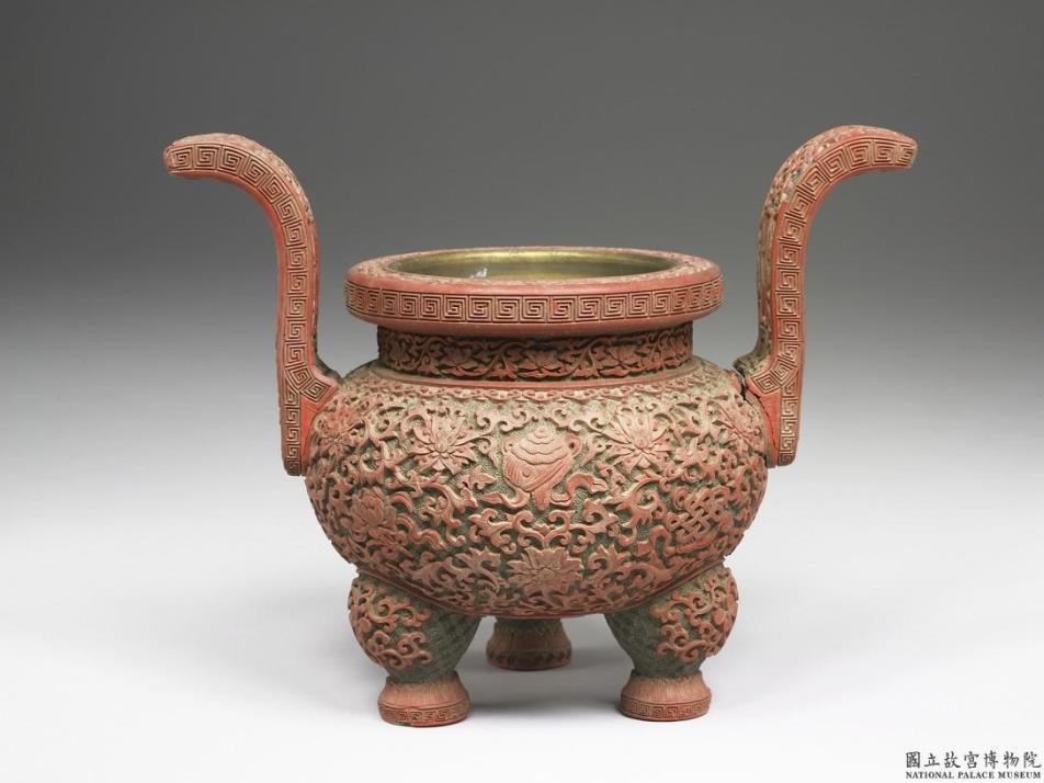 炉,圆腹,双长耳,三兽蹄形足。外髹朱漆和绿漆,内有铜胆。口沿、耳侧雕回纹,颈、腹、耳面雕卷枝番莲纹,腹加饰八宝纹,衬以菱格朵花锦地纹,足上半雕菱格朵花锦地卷枝花卉纹,下半雕变形莲瓣,足沿雕回纹一周。口沿雕「大清乾隆年制」六字篆款。