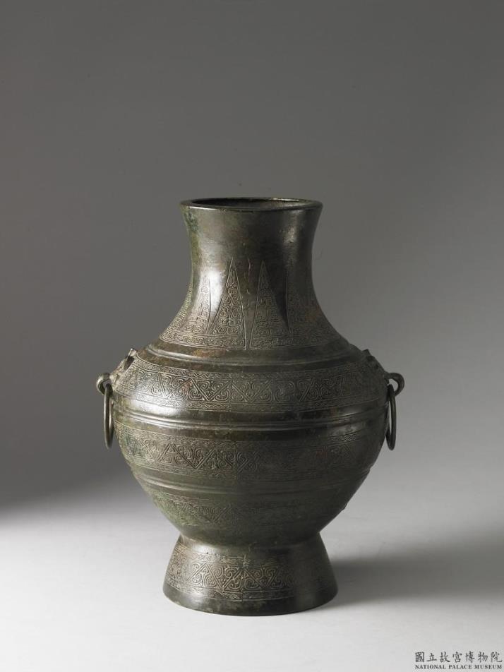 撇口,长颈,斜肩,圆腹,高圈足,器肩两侧有兽首衔环。器身饰三带纹,肩、腹及足共饰三角云纹四道,各围以绹纹,颈饰三角蝉纹及云纹。著录于《西清续鉴‧乙编》卷九页九,作「周兽环壶六」。