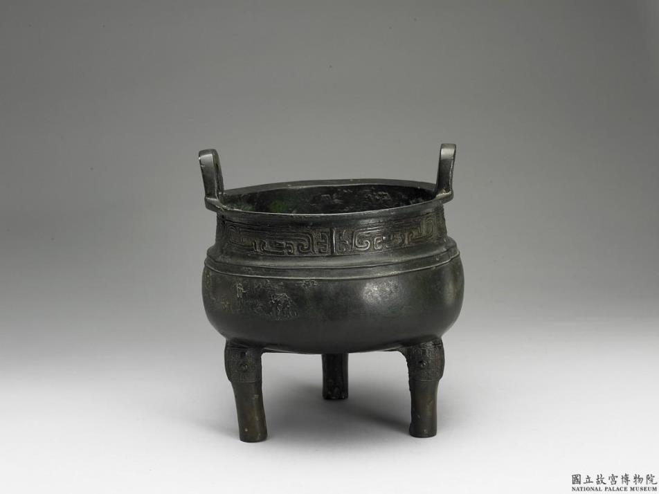 立耳,盘口,束颈,圆腹,柱足。颈部有窃曲纹带,腹部两道凸弦纹,足饰兽面纹。