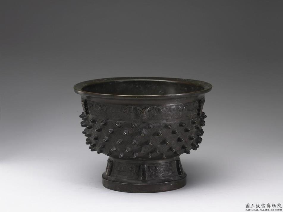 敞口折沿,深壁略收,圆弧底,高足。外壁纹饰分为上下两部份,上层窄如束颈,下层广包腹外壁。下层以直接相交为网纹,每一四边形网眼中,都沿着边廓饰回纹一圈,网眼中央则凸起乳钉。上层以凸棱、兽面等距分割器面,饰以云雷纹地夔龙。足胫外纹样设计与之类同,只是纯以凸棱分割壁面而未见兽首。铭文位于器底心。