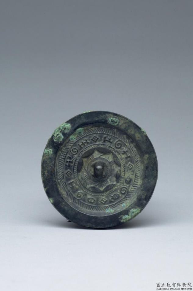 圆镜,铭文八字,在背面外区一周。背面素边,外区铭文间,列云雷纹,内轮作连弧纹,素鼻。