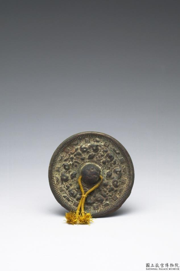 圆镜,半球钮、圆钮座。镜背上下各饰一端坐仙人,两旁有瑞兽及跪姿人物。镜缘以方形铭文与莲花间接排列,铭文为:「刘氏作,宜官位,其师吉羊。」