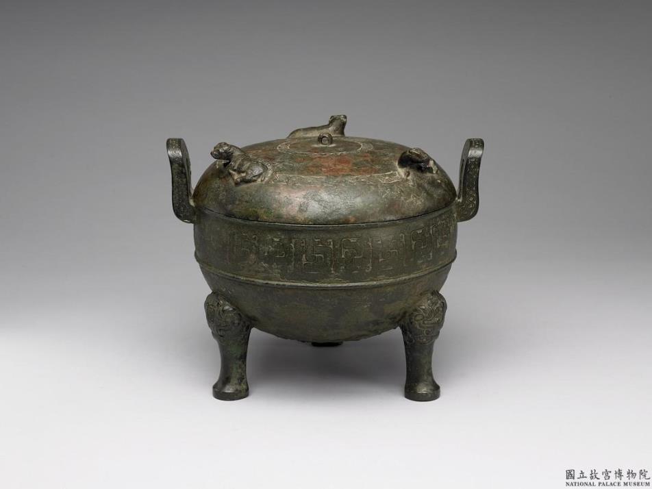 鼎,附钮盖,盖上有三动物立雕,子母口、立耳、圆腹、兽足。器盖与耳上饰有绹纹,口沿下有蟠螭纹,腹中央有一凸弦纹。