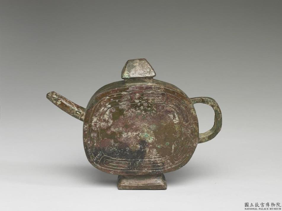 盉,梯形钮,扁圆腹,管形流,环把,方圈足。腹部饰重环纹。