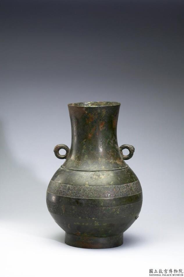 圆壶,长颈、鼓腹、圈足,颈上二兽首环耳。肩饰弦纹,腹饰兽带纹。腹部伤破。