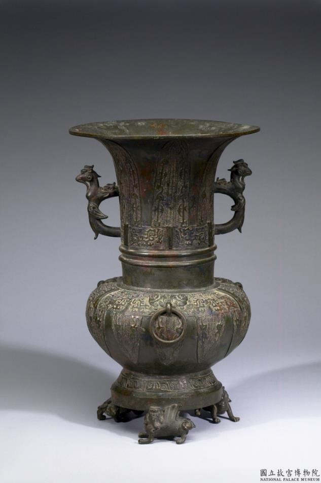 尊形壶,撇口,长颈,双环耳,折肩,圆腹,阶状圈足,圈足下有三兽足,耳做兽首形。脰至颈部有蕉叶纹、夔龙纹饰带与两道凸棱,肩至腹部饰夔龙纹与蕉叶纹,在肩部另饰三铺首衔环,圈足为窃曲纹。