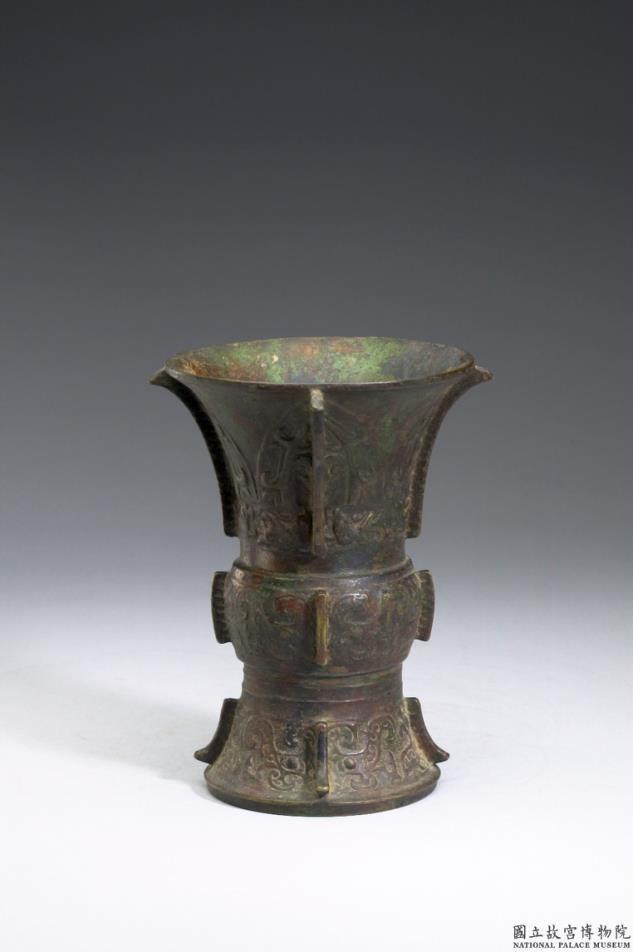 三段式尊,敞口,圆腹,圈足,有棱脊。脰部为小鸟纹饰带与向上延伸的蕉叶纹,腹与圈足处则饰兽面纹。