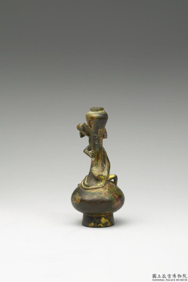 瓶,蒜形口,长颈,鼓腹,圈足。全器鎏金,颈饰立雕蟠龙,身躯盘踞扭动,动感十足。