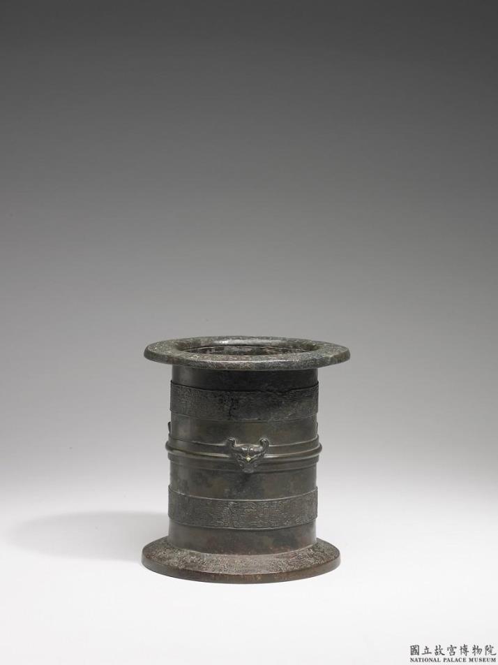 车器,器呈筒状,两端作宽缘。器外壁饰三嵌金银兽首、蟠虺纹。口沿有铭「子孙永宝」四字。