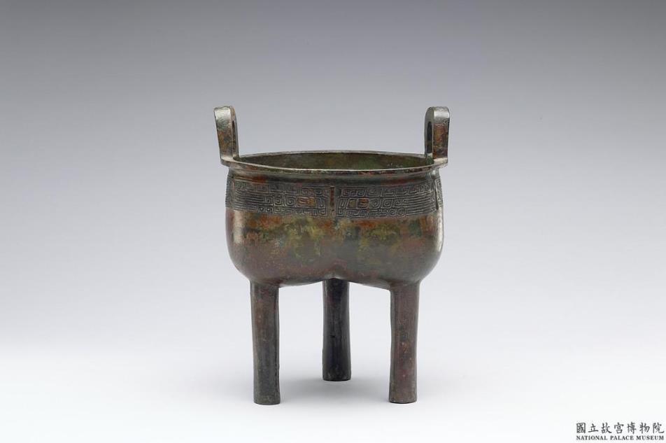 鬲鼎,折沿,立耳,分裆底,柱足。口沿饰下兽面纹饰带。