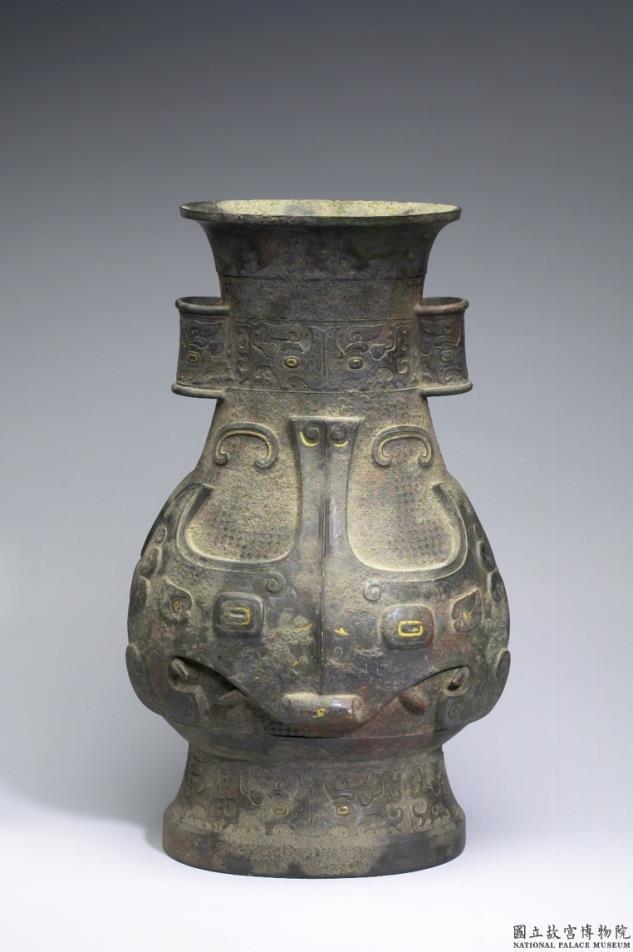 贯耳壶,椭圆口微侈,椭圆腹,圈足。颈、耳、腹、足皆饰兽面纹、云雷纹为地,部分留有金属镶嵌痕迹。