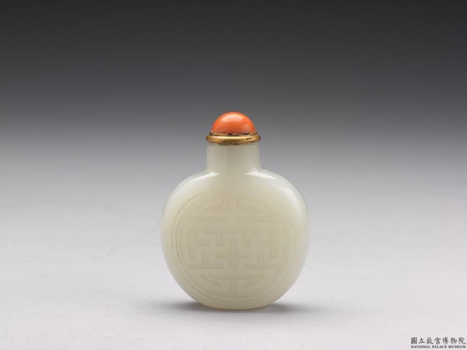 玉鼻烟壶,直圆口,球形扁腹,无足;玉色灰白温润,一面浅浮雕梧桐树、双雉等,另面浮雕团卍寿字。带铜嵌珊瑚盖与牙匙。