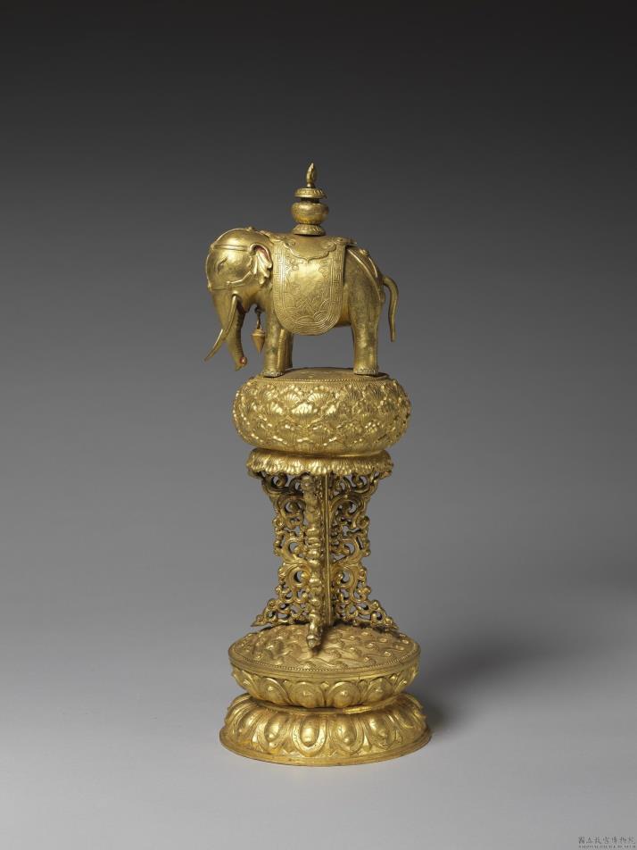 宝象装饰华丽,胸前悬珠饰,背上均驼有宝瓶,置于莲花座上,莲花下以四片卷叶承托置于圆形台座上,台座上刻水波纹及仰覆莲瓣。