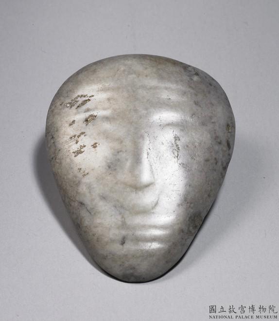 灰玉雕一颇写实的老者面孔。浅磨出眼、鼻、嘴,及额头上的皱纹。背面光素微凹,钻一隧孔以穿绳佩挂。与红山文化大致并存的赵宝沟文化遗址中出土相似的泥塑人面。(引自《故宫玉器精选全集‧第一卷‧玉之灵‧I》)