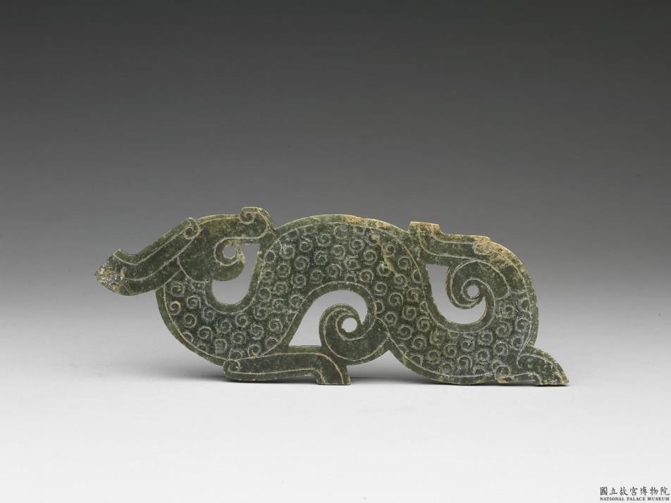 丧葬玉,玉质深碧,作工简化,纹饰粗略,尺寸过大难以佩戴。