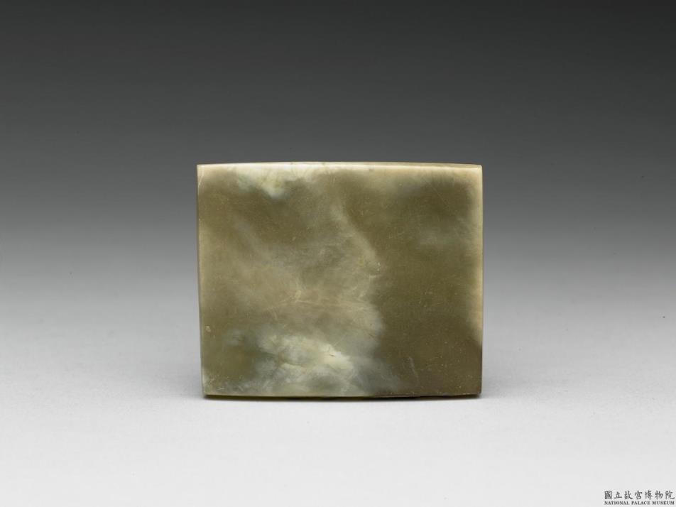 青绿色玉石,局部沁作灰白色。长方形带版,带版背面,有三至四组的隧孔,内中有残余的金属与织物。都平素无纹。
