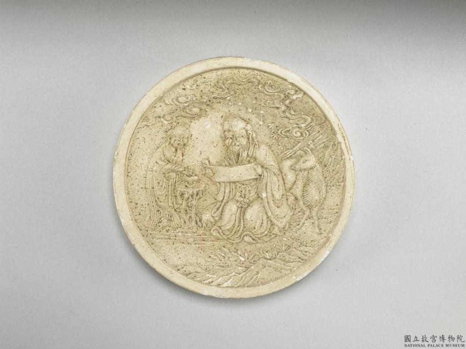 白色颜料墨,圆形,边框起棱。一面模印南极仙翁童子图像,就中仙翁坐而展卷熟视,童子陪侍于侧,童子手正抚触架上之容器,仙翁另一侧则有一鹿望向仙翁。另一面之金线长方形框有「南极见则人主寿昌,天下太平」隶书金字,墨侧有「方于鲁监制」款识。该色墨一式五件,颜色彼此不同,分别为黄、绿、蓝、白、红,五块色墨同储于漆方盒中。